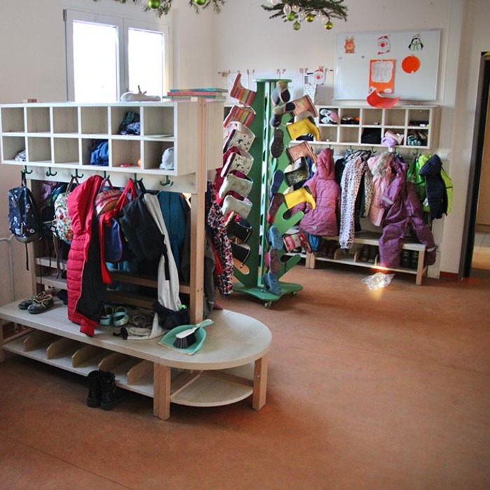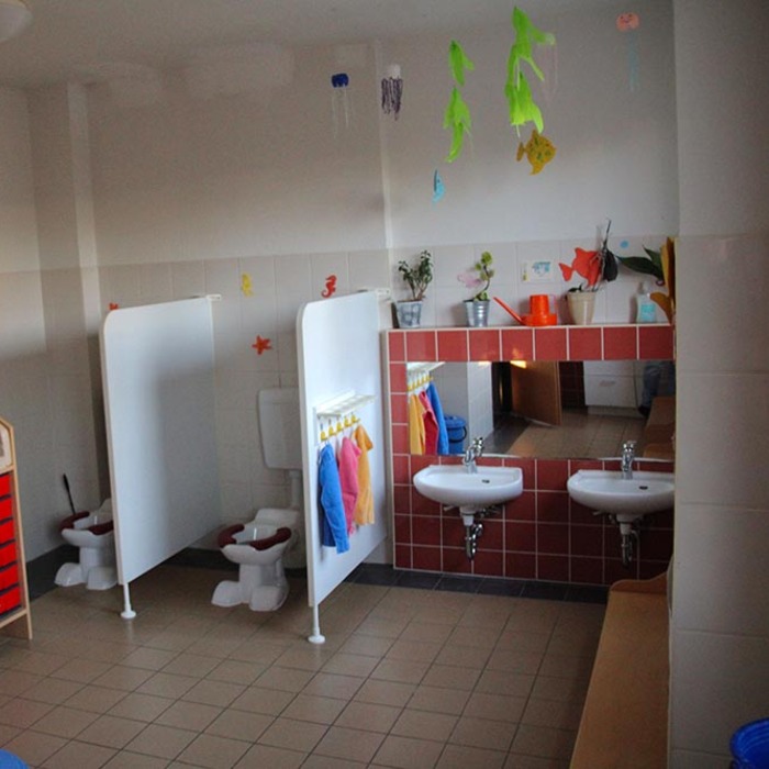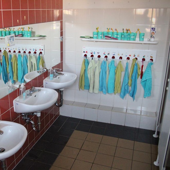 Jede Gruppeneinheit verfügt über eine Garderobe und einen Waschraum mit Toiletten. In jeder Etage befindet sich zusätzlich eine Dusche.
