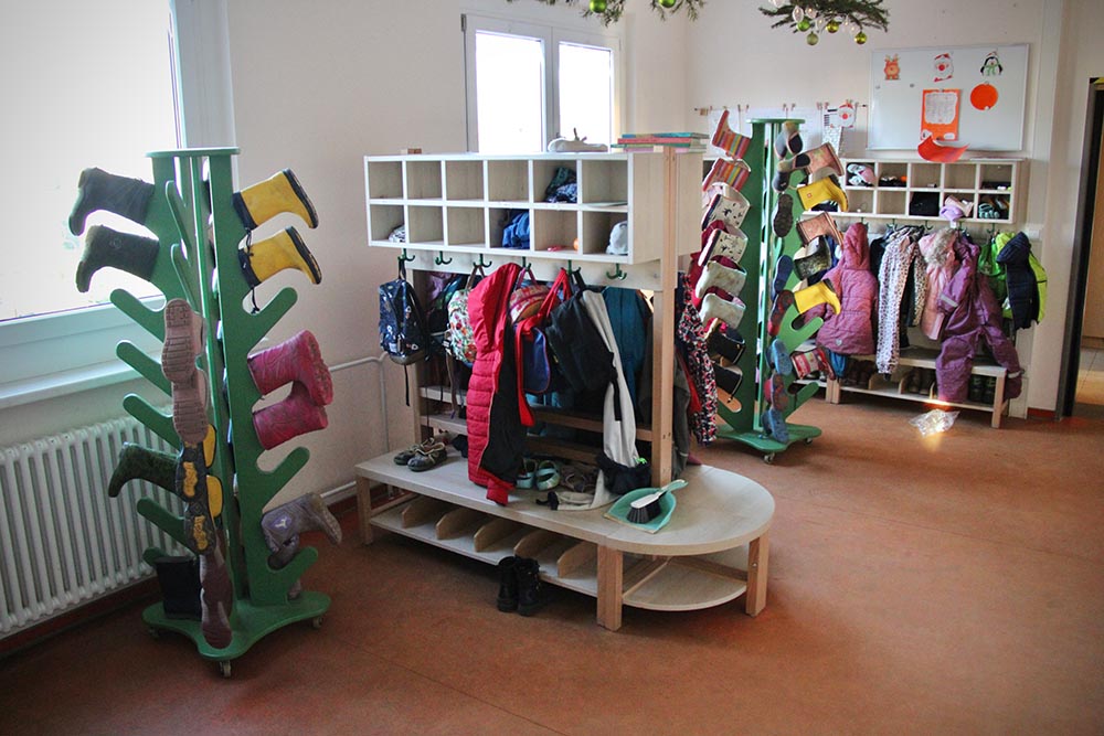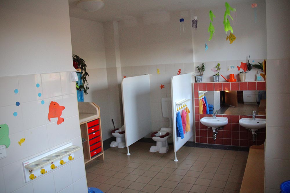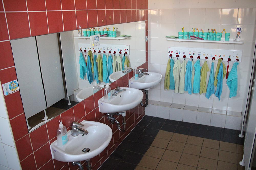 Jede Gruppeneinheit verfügt über eine Garderobe und einen Waschraum mit Toiletten. In jeder Etage befindet sich zusätzlich eine Dusche.