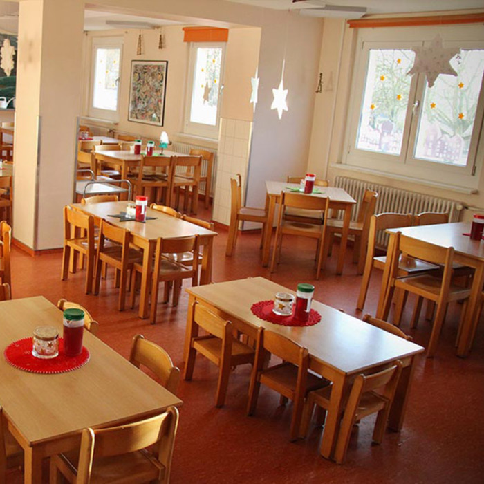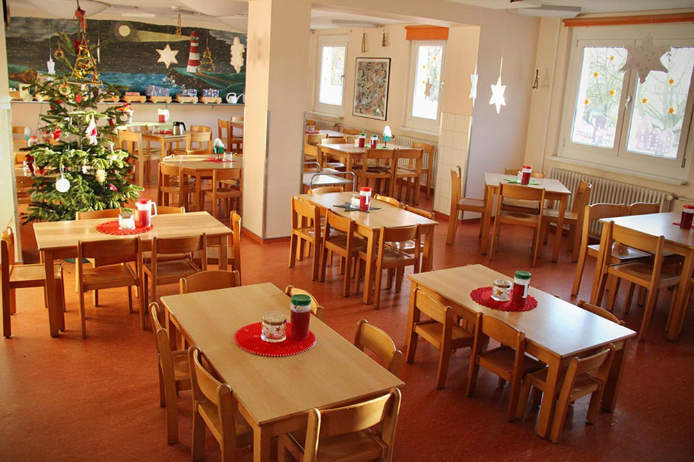 Unser großer Essenraum im Erdgeschoß ist dabei der Mittelpunkt für die Kindergarten- und Hortkinder. Hier werden gemeinsame Mahlzeiten zu sich genommen aber auch Auftritte und Versammlungen durchgeführt.
