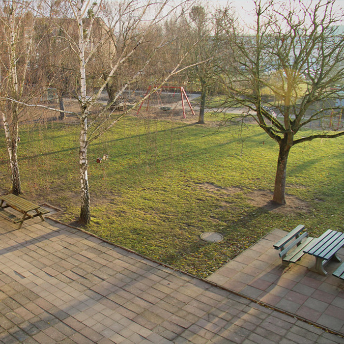 Unser Außengelände verfügt über eine Freifläche von 2.400m² und besticht durch viel Natur, zahlreiche Bäume und Pflanzen. Der Hof unterteilt sich in zwei Bereiche. Während die Kinder aus dem Krippenbereich einen eigenen Bereich mit altersgerechten Spielgeräten haben, ist das restliche Gelände auf unsere Kindergarten- und Hortkinder abgestimmt.