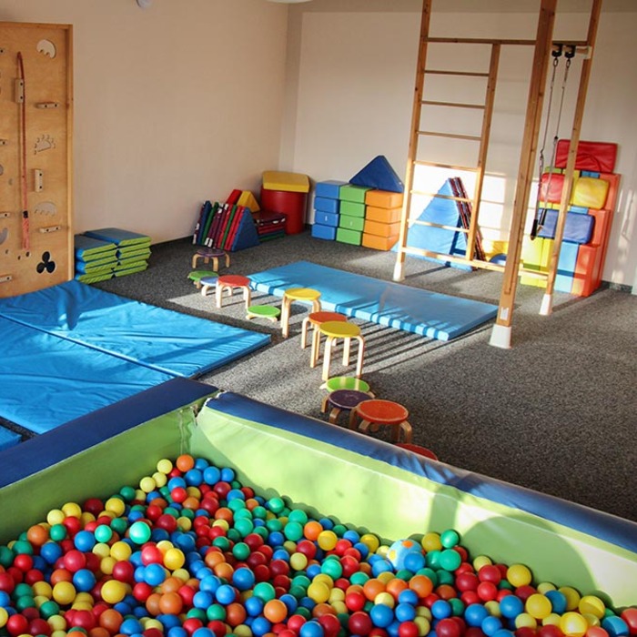 In unserem Kellergeschoß ist der Sportraum für unsere jüngeren Gruppen, wo sich auch eine Toilette und zwei weitere Duschen anschließen. Unsere älteren Kindergruppen nutzen die anliegende Turnhalle der Stadt.