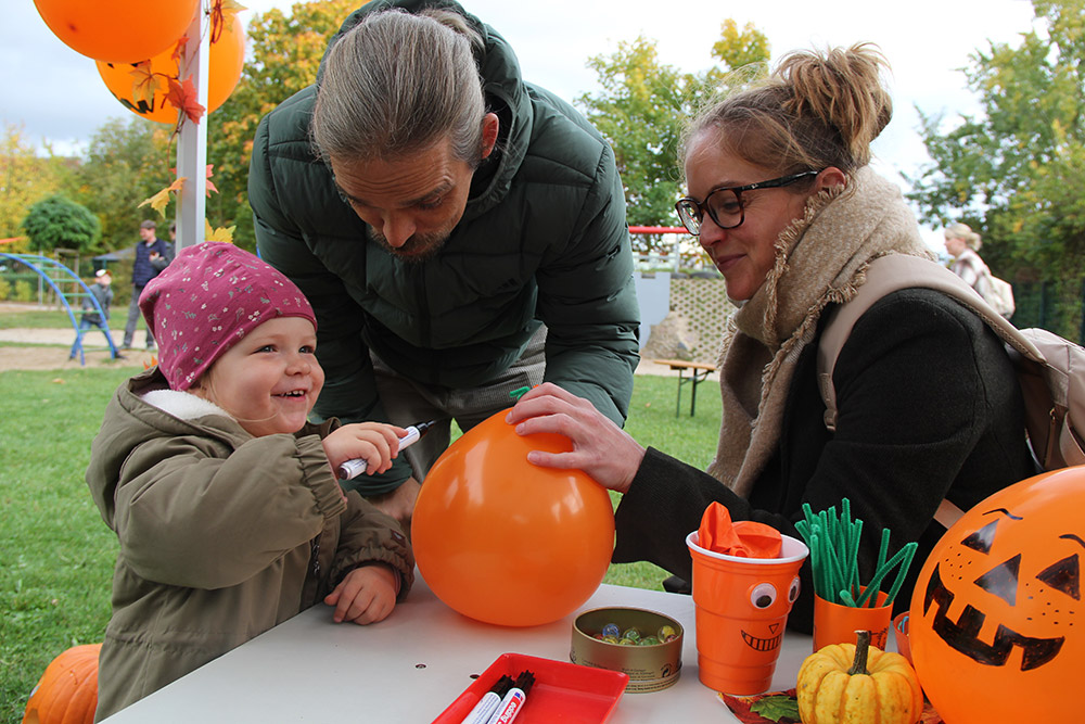 Am Tag des großen Festes wurden die Kürbisse auf dem Kita Hof platziert und sorgten zudem für eine stilechte Kulisse. Neben einem bunt geschmückten Hof und der Verkündung der „besten“ Kürbisse erwartete die Kinder, Eltern und Gäste an diesem Nachmittag ein abwechslungsreiches Programm aus Mitmachstationen und Bastelangeboten. Egal ob Kürbisolympiade, Beuteldruck, Zielwerfen, Schätzen und Zählen, Schubkarrenrennen oder einem Erinnerungsbild an der Fotostation, für jung und alt, groß und klein war einiges geboten. Eine große Strohburg auf dem Hof lud zusätzlich zum klettern, toben und Spaß haben ein. Kulinarisch versorgt wurden die Gäste an diesem Tag durch ein liebevoll gestaltetes Buffet der Eltern aus Kuchen und Dips und einer gesponserten Kürbissuppe vom BMTT. Aufgrund der zahlreichen Vorbereitungen und vielen Helfer bestach dieser Nachmittag neben seinen ganzen Attraktionen durch seine ganz besondere Atmosphäre. Weniger laut und hektisch, dafür sehr gelassen und wertschätzend. Durch eine kleine Idee und vielen engagierten Menschen, stand am Ende ein wundervoller Nachmittag zu Buche, der allen Besuchern viel Freude bereitet hat.