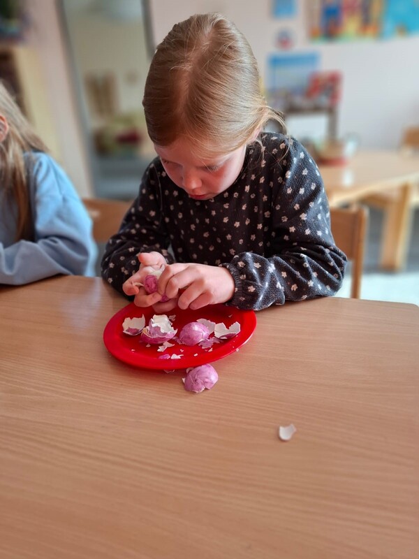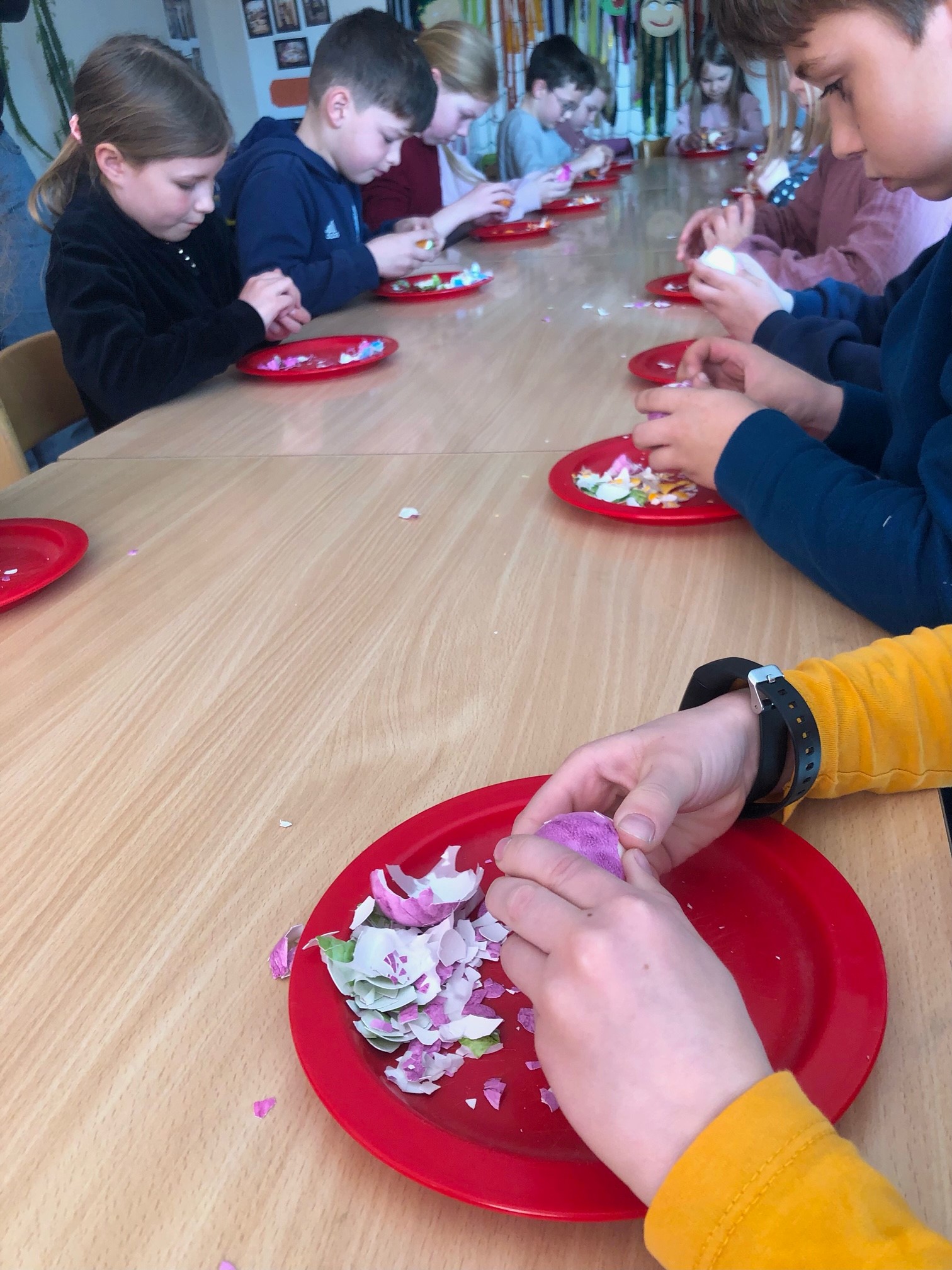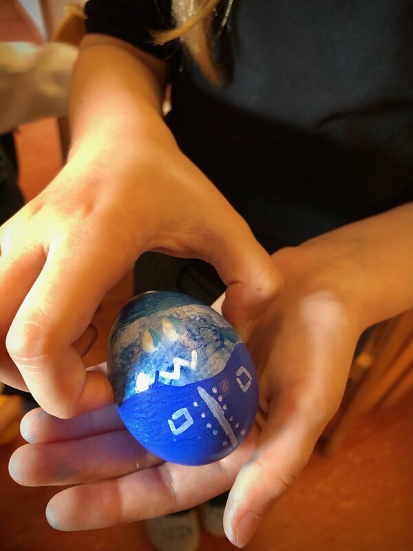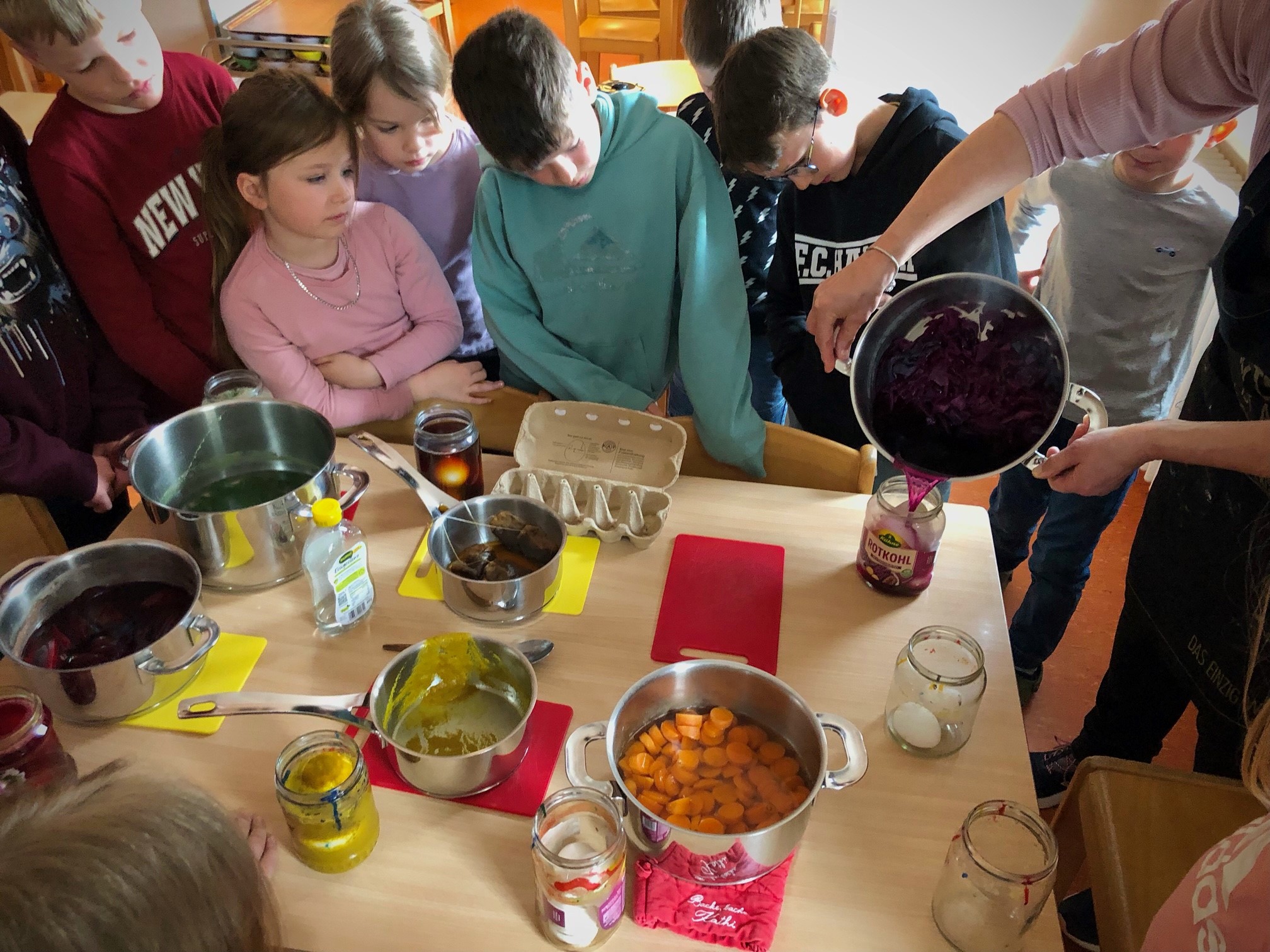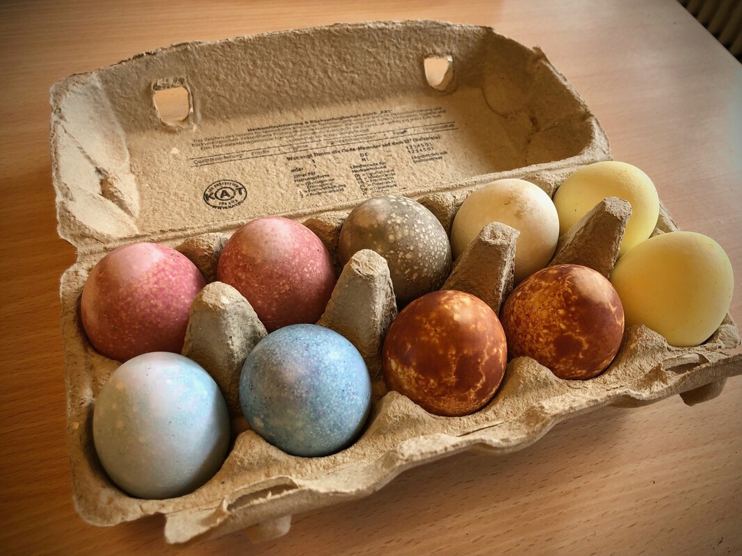 Unsere Ferienkinder erwartete mal wieder ein prallgefülltes Ferienprogramm. Thematisch sollte sich dabei viel ums Ei drehen. Zum Start in die Osterwoche durften die Kinder Eier selbst gestalten und anmalen. Doch auch der Prozess des Einfärbens der Eier, wurde gemeinsam mit den Kindern erarbeitet. Mit herkömmlichen Lebensmitteln (Schwarzer Tee, Spinat, Rotkohl, Kurkuma, Möhren, rote Beete) kochendem Wasser, einem Schuss Essig und etwas Geduld entstanden wie durch Zauberhand die buntesten Muster.