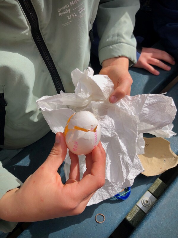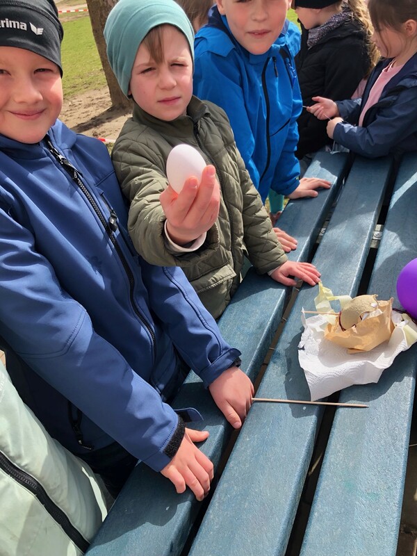Neben den klassischen Osteraktivitäten konnten sich die Kinder auch als "Wissenschaftler" ausprobieren. Im Experiment "das fliegende Ei" mussten die Jungen und Mädchen mit vorgegebenen Materialien versuchen ein rohes Ei so auszustatten, dass es unbeschadet den freien Fall aus dem Fenster übersteht. Die Kreationen waren sehr einfallsreich und teilweise auch von Erfolg gekrönnt.